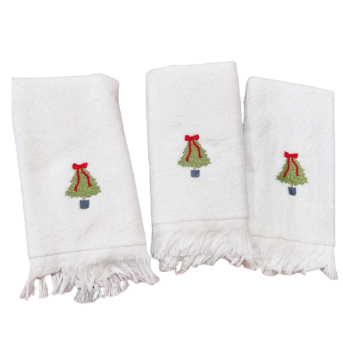 Add a touch of festive charm to your kitchen, powder room, or holiday table-scape with our beautifully embroidered Christmas Hand Towel. Featuring timeless monograms, wreaths, and chinoiserie-inspired Christmas tree motifs, this classic piece is perfect for gifting or elevating your own seasonal décor. Each towel is stitched with care, bringing heirloom-quality elegance into your home.