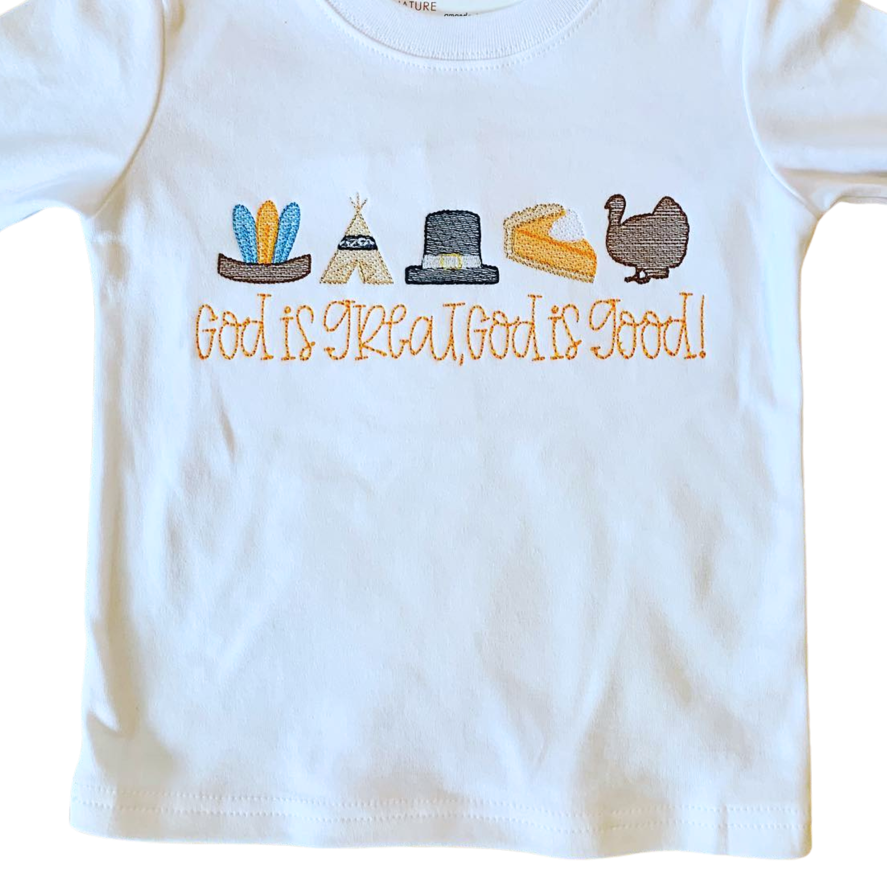 Our God is Great Design is a sweet and meaningful way to celebrate Thanksgiving. This embroidered kids’ Thanksgiving shirt features festive fall icons – feathers, a teepee, pilgrim hat, pumpkin pie, and a turkey – beautifully arranged above the excerpt of the familiar childhood table prayer “God is Great, God is Good, Let us thank Him for our Food!" Perfect for church gatherings, family dinners, and holiday photos, this faith-based Thanksgiving shirt blends festive style with a message of gratitude.