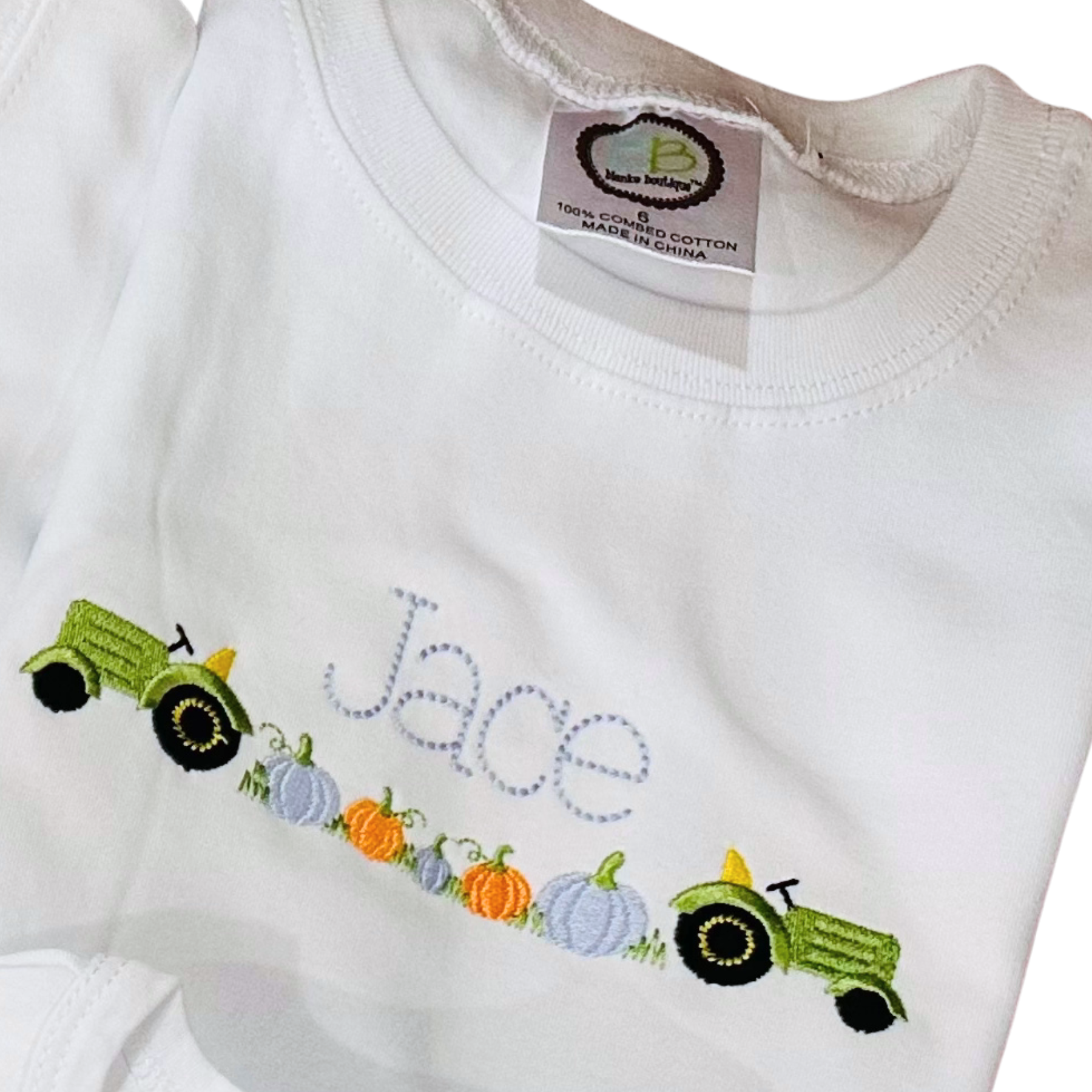 Bring fall fun to your little one’s wardrobe with our Pumpkin Farmer Design! This personalized embroidered shirt features playful green tractors and colorful pumpkins, stitched with bright fall tones and can be customized with your child’s name. Perfect for pumpkin patch visits, fall festivals, Thanksgiving gatherings, and seasonal photos, this tractor and pumpkin embroidery shirt is a customer favorite.