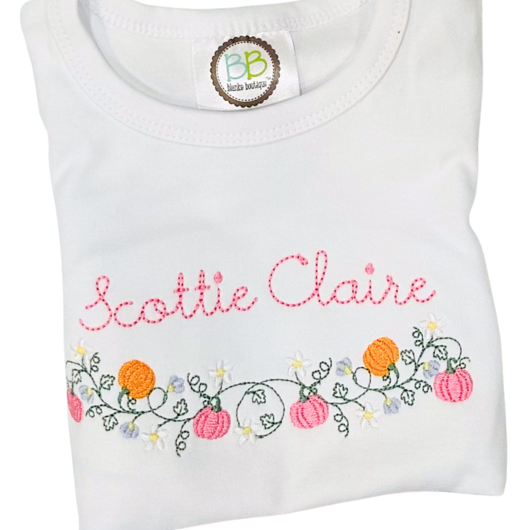 Celebrate the beauty of autumn with our Pumpkin Vine Design! This personalized embroidered shirt features a delicate stitched vine adorned with pumpkins, flowers, and leaves, paired with your child’s name in charming script. Perfect for fall festivals, pumpkin patch visits, Thanksgiving gatherings, and seasonal photos, this custom fall outfit brings cozy elegance to your little one’s wardrobe.