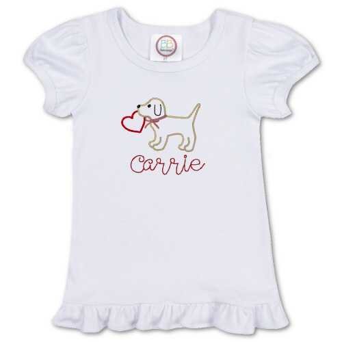 Our Puppy Heart Design features a sweet embroidered puppy holding a heart, paired with a personalized name for an extra-special touch. Available on both classic tees and ruffle-hem tops, this charming design is perfect for Valentine’s Day and everyday wear for little dog lovers.