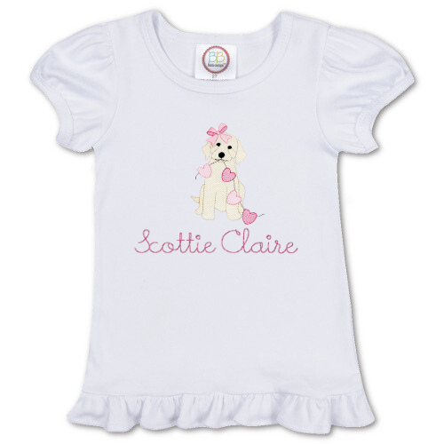 Our Puppy Hearts on a String Design features an adorable embroidered puppy with sweet hearts dangling on a string, finished with a darling bow detail. Paired with a personalized name and stitched on a classic white ruffle-hem top, this charming design is perfect for Valentine’s Day and little ones who love all things sweet and cuddly.