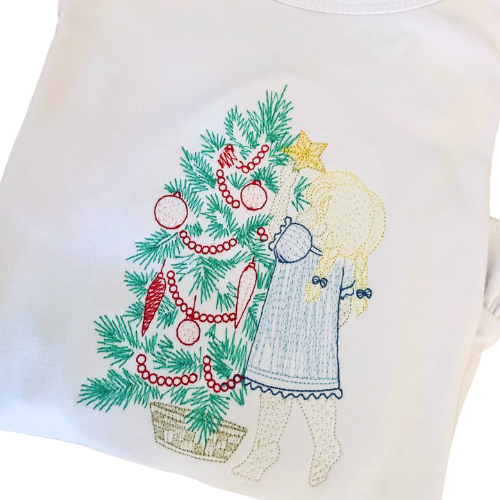 - Heirloom-style embroidered Christmas tree & child silhouette