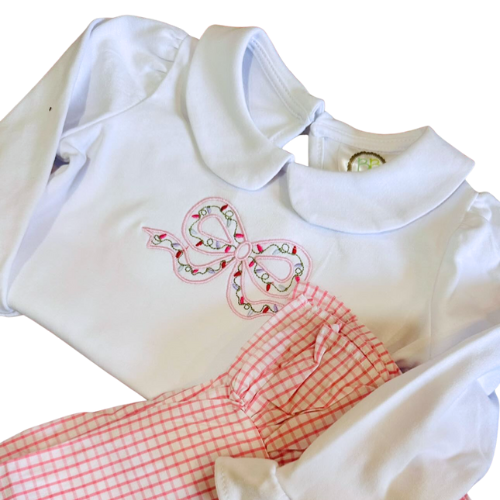Twirl into the magic of the season with our String Light Bow Design - a darling embroidered bow accented with whimsical Christmas lights. Perfect for festive family outings, Christmas card photos, or dressing up for Santa’s visit. Classic, sweet, and full of holiday sparkle!